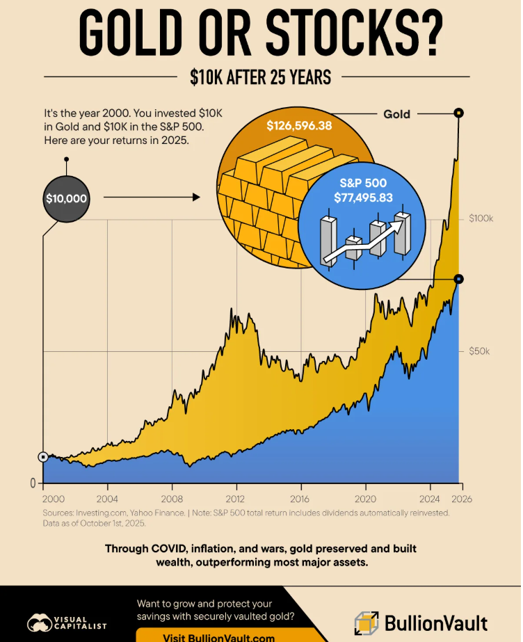 Tổng 25 năm 10,9% 7,98% +63,4 Vàng: $10K → $126K; S&P: $10K → $77K