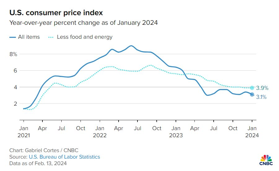 CPI của Mỹ từ tháng 1/2021 đến tháng 1/2024 / Theo CNBC